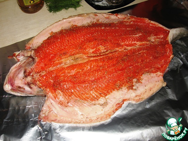 Разделать лосося: Помыть рыбу в прохладной проточной воде. Далее выпотрошите ее и очистите от чешуи (я чищу в кульке, что бы чешуя не разлеталась по кухне) и снова промойте. Удалите жабры. Срежьте ножницами все плавники. Протрите рыбу бумажным полотенцем, положите ее на бок и отрежьте ножницами косточки мелкие от хребта. Затем острым ножом отделите филе от хребта с обоих сторон, осторожно, не повредите кожу! Перережьте спинной хребет кухонными ножницами как можно ближе к голове рыбы. Затем отделите позвоночник от мякоти и просто вытяните хребет из рыбы, подрезая ножницами у кожи. Подрежьте ножом мелкие косточки, отделяя их от филе, затем удалите оставшиеся мелкие косточки руками или пинцетом. Останется шкурка и мясо. Разверните рыбу, сбрызните свежевыжатым соком из половины лимона, посолите, поперчите и посыпьте приправой для рыбы.