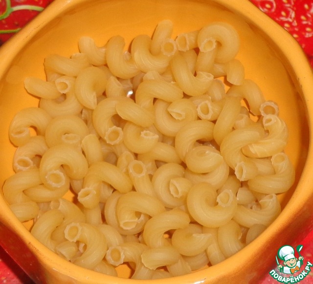 Затем отварить макароны до полу готовности в подсоленной воде. Откинуть на дуршлаг и высыпать в миску.