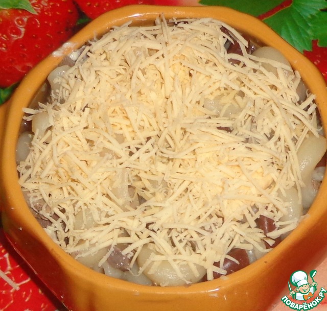 Наполняем горшочек на 2/3 теплой водой и посыпаем сверху тертым сыром. Накрываем крышкой.