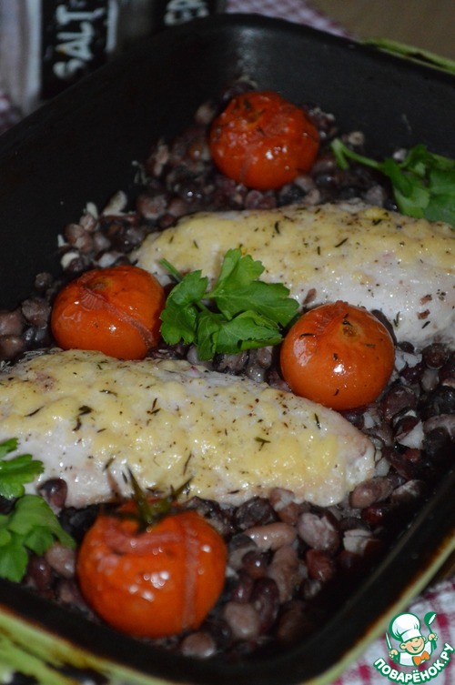 Куриную грудку разделать на филе, кожу снять. В жаропрочную форму налить оливковое масло 1 ст. л. Выложить филе, посолить и поперчить по вкусу, посыпать тертым сыром. Рядом выложить фасоль.