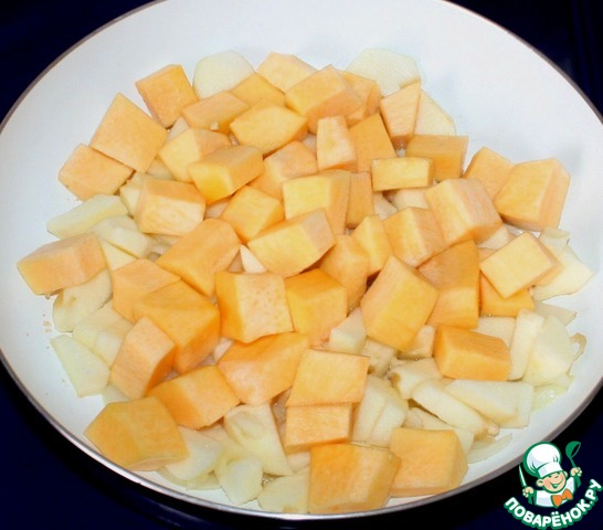 К обжаренному луку добавить тыкву и яблоко и слегка обжарить.