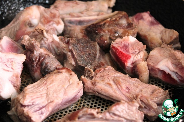 Ребрышки мою, режу и обжариваю 5 минут в сковороде на растительном масле.