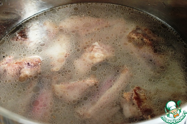 Перекладываю ребрышки в глубокую кастрюлю, вливаю 1 литр воды, добавляю соль, ставлю на огонь. Довожу до кипения, убавляю огонь и варю 1 час.