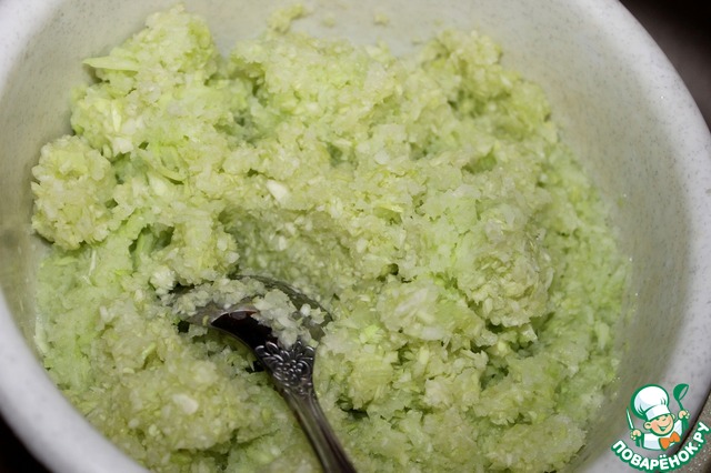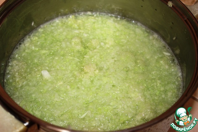 В это время измельчаю в чаше блендера капусту (я измельчала в несколько заходов). Перекладываю ее в кастрюлю и заливаю крутым кипятком. Оставляю на 5 минут.