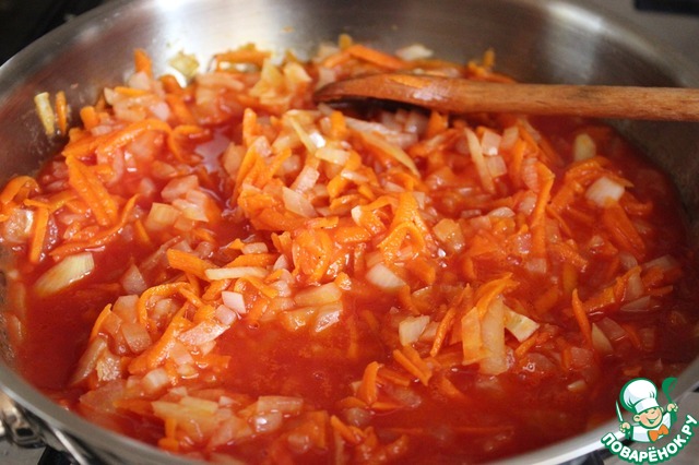 Готовлю поджарку из овощей. Морковь чищу и тру на крупной терке. Лук мелко режу. В сковороду вливаю растительное масло, обжариваю овощи 5 минут, затем вливаю томатный сок. Довожу до кипения, выключаю.