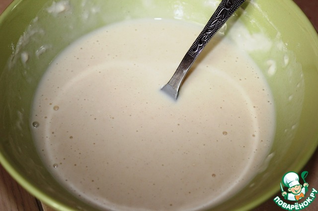 Дальше делаю мучную заливку. В глубокую миску просеиваю муку, добавляю молоко и взбиваю вилкой. Консистенция должна получиться как на блины.