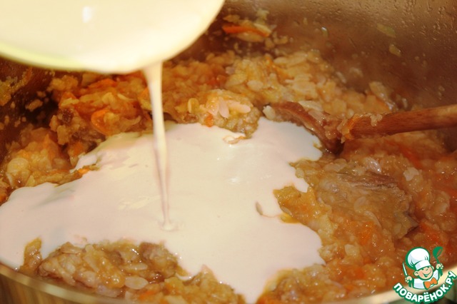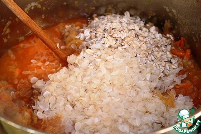 Затем добавляю в кастрюлю поджарку. Всыпаю рисовые и овсяные хлопья. Перемешиваю.