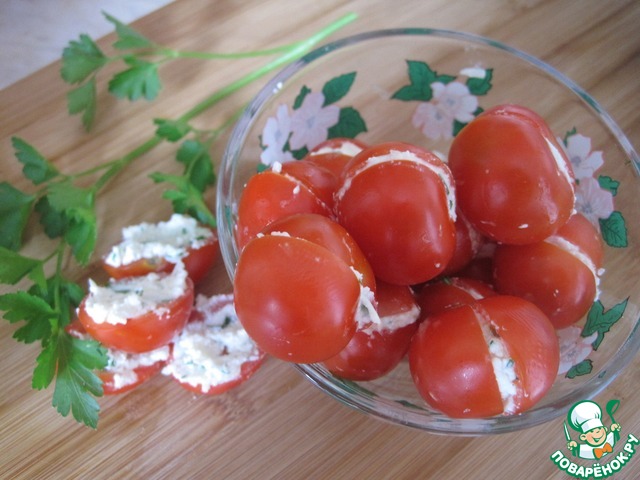 Черри режем пополам и аккуратно маленькой ложечкой вынимаем мякоть. Получаются вот такие "скорлупки". Я использовала фарфоровую ложечку.