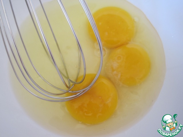 Теперь пришло время включить духовку для разогрева. Температура 180 градусов. И займёмся тестом. Яйца взбиваем в мисочке, солим, вливаем молоко и снова взбиваем.