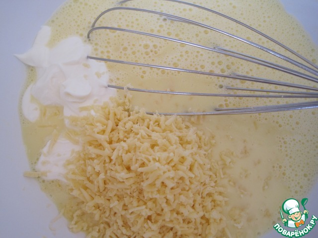 Добавим сметану и тёртый сыр, всё перемешиваем.