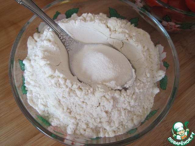 Муку просеиваем с разрыхлителем и добавляем к яично-молочно-сырной смеси. Снова всё перемешиваем, что б не осталось комочков. Тесто по консистенции похоже на блинное.
