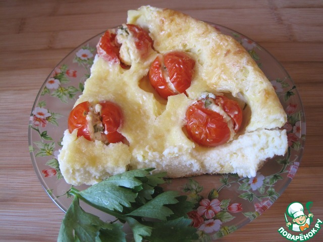 И нам осталось смазать форму сливочным маслом, вылить тесто в форму и равномерно распределить фаршированные помидоры. Время выпечки зависит от духовки. У меня на выпечку ушло 45 минут. За это время клафути заметно поднялся и зарумянился.