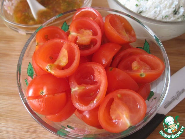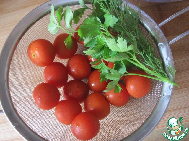 Помидорки-черри и зелень моем-сушим. Зелень мелко рубим- у меня петрушка и укроп.