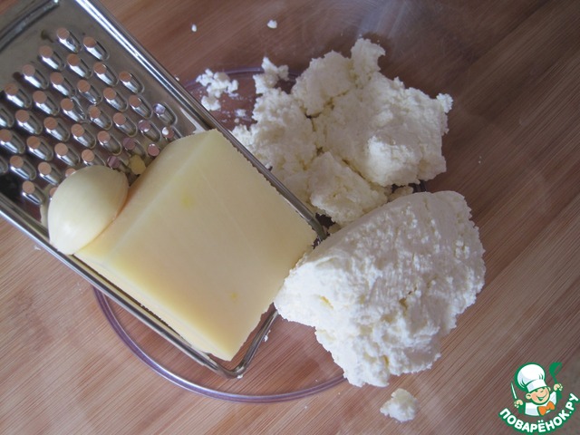 Приготовим начинку для помидоров-чеснок и пармезан трём на мелкой тёрке, смешиваем их с творогом, добавляем зелень и столовую ложку яичного белка, что б связать начинку.