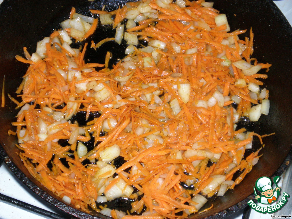 Натереть на крупной терке морковь, нарезать лук и тоже обжарить на сковороде. Добавить нашинкованный болгарский перец.