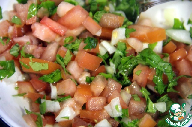 Готовим пико де галльо (the pico de gallo). Это мексиканский соус. Для этого измельчаем помидор, 1/4 лука и петрушку. Добавляем лимонный сок и соль по вкусу и хорошо перемешиваем.