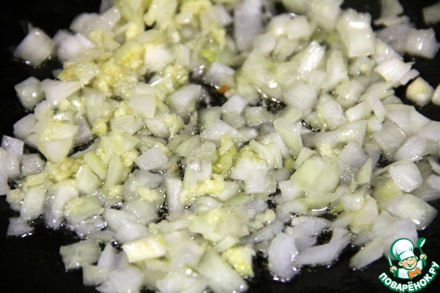 Оставшийся лук мелко режем. На сковороде пассируем лук и мелко нарезанный чеснок с добавлением оливкового масла. Около 2 минут.