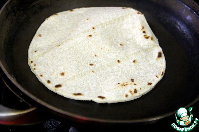 Тортильяс кладем на раскаленную сковороду и обжариваем примерно по 1 минуте с каждой стороны.