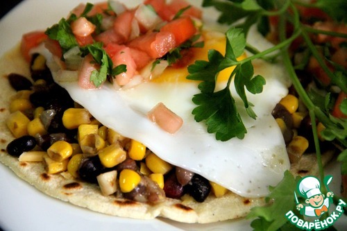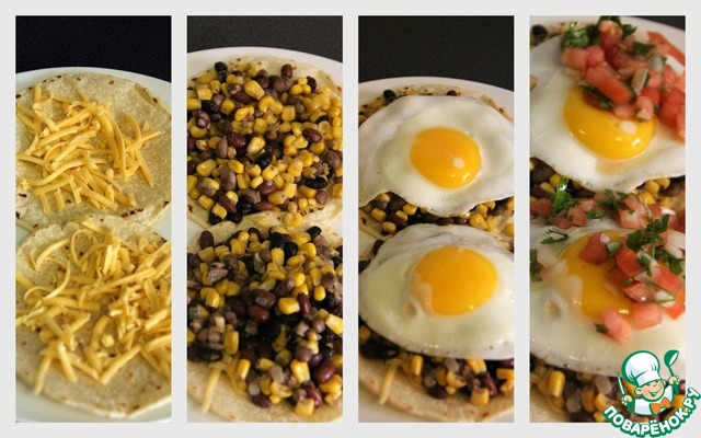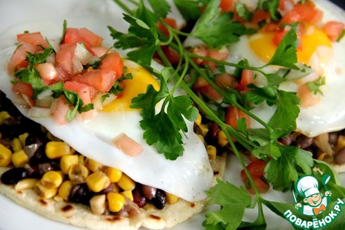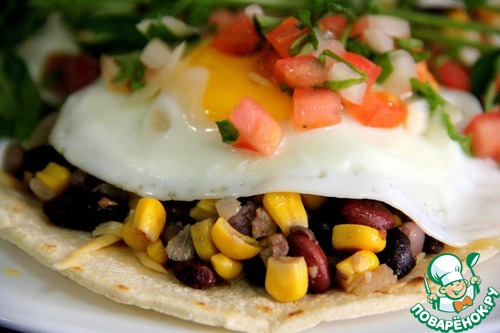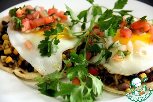 На тарелку кладем тортильяс, сверху немного сыра, затем фасоль и яйцо. Сверху добавляем немного пико де галльо.