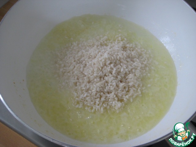 Всыпать к луку рис, прогреть рис 2 минуты, влить к рису половину вина, дать выпариться алкоголю