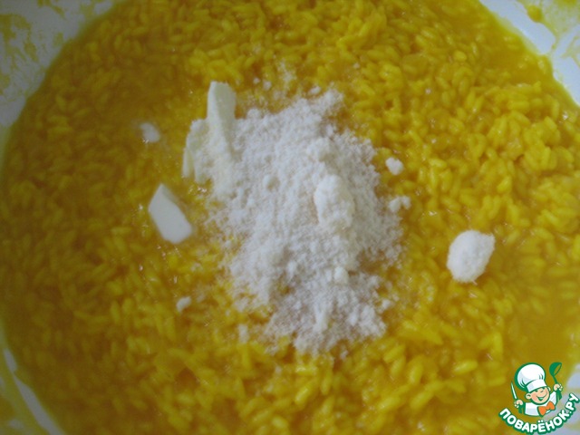 Затем по одному половнику добавлять бульон, готовить рис, переодически помешивая. В одном половнике горячего бульона развести шафран, добавить к рису. Готовить рис 14 минут до состояния аль денте, посолить.