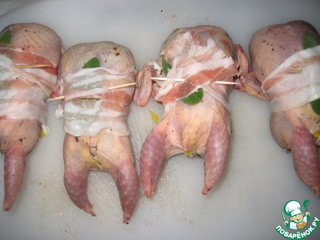На грудку каждой перепелки положить по листику шалфея, обернуть беконом, закрепить бекон зубочисткой.