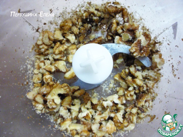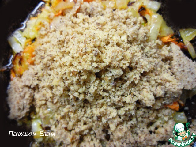 Кладем ореховую крошку и еще 1 минуту обжариваем, постоянно помешивая.
