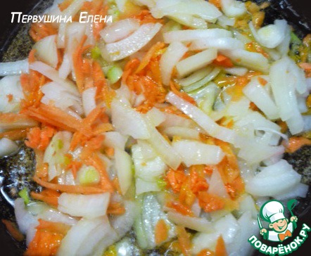 В сковороду наливаем масло, выкладываем туда овощи и обжариваем до золотистого цвета.