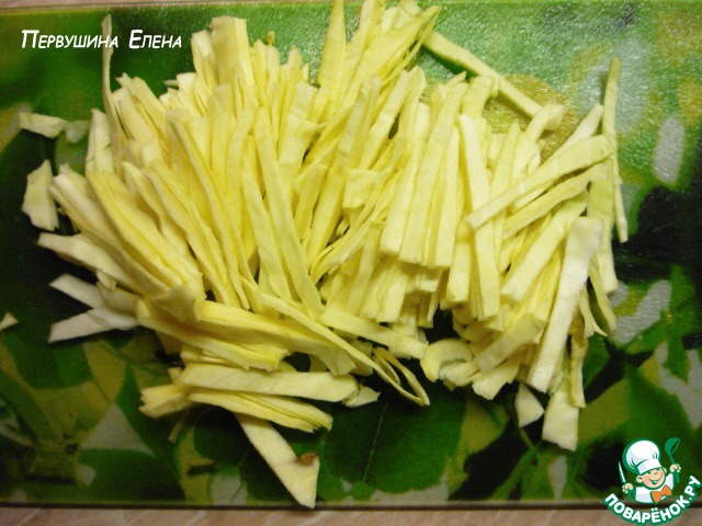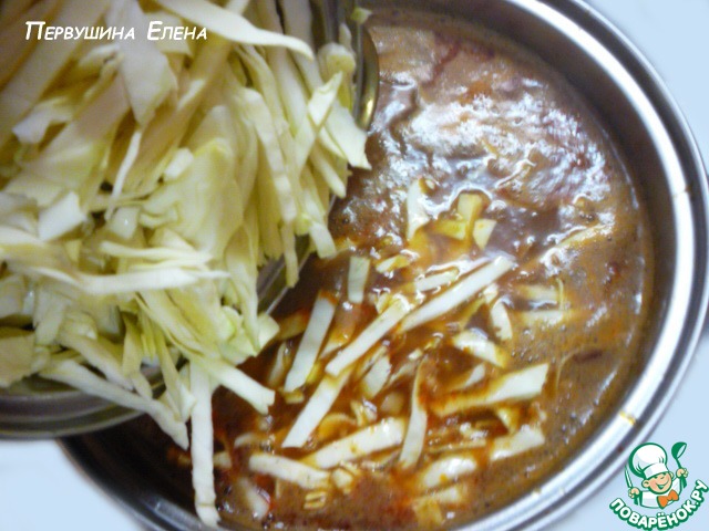 Когда картофель уже сварится, вместе с зажаркой, кладем капусту в будущий борщ.