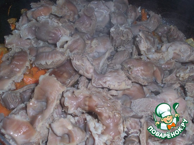 На сковороде обжарить лук и морковь, посолить, добавить пупки и обжарить минут 10.