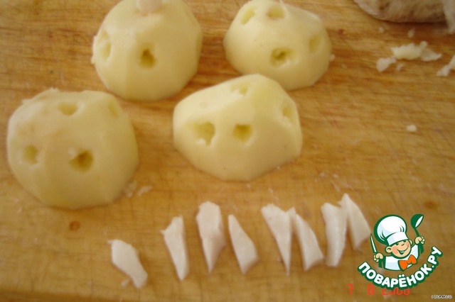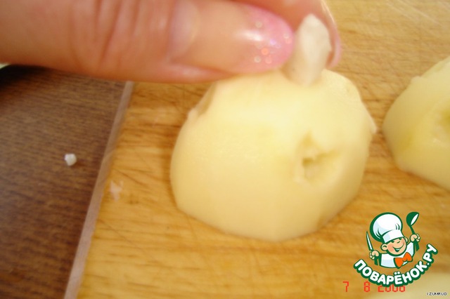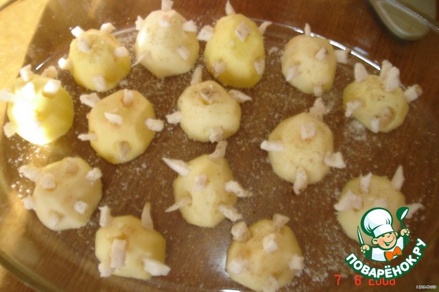 нарезать сало маленькими кусочками(одна сторона кусочка остренькая чтоб легче вставлять сало в отверстие картошки)