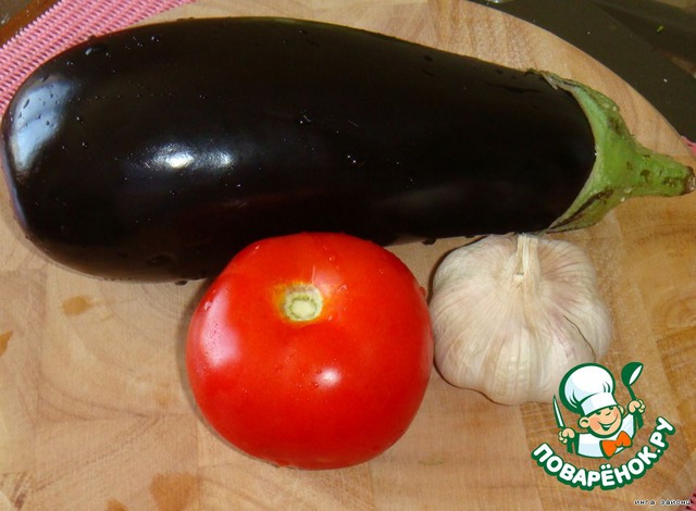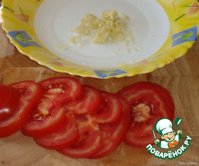 Помидорку взять таких размеров, чтоб кружочек соответствовал размеру баклажанчика. Нарезать, выдавить чеснок.