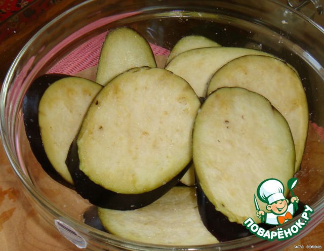 Баклажаны нарезать кружочками, посолить (чтоб вышла горечь) и оставить на пол часа.