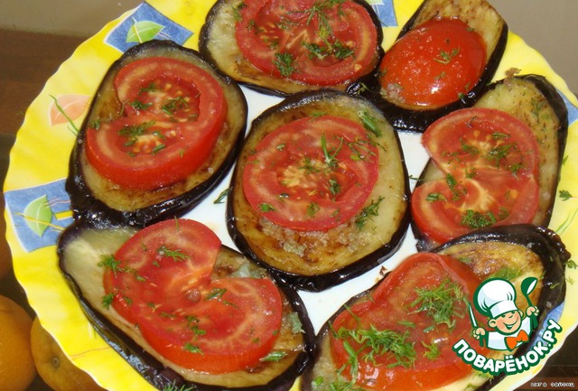 В нашей семье делалась подобная закуска немного иначе, баклажан нарезался вдоль "языками", каждый "язык" разрезался вдоль не до конца, куда вставлялись кусочки перца чили и тонко нарезанный чеснок. Ну и помидорки. Для меня тот вариант всегда был слишком сложный и почти всегда острый. Так что я упростила.