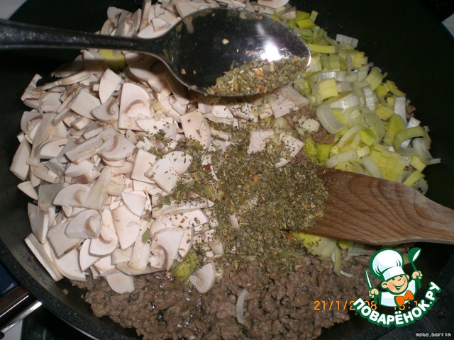 5. Когда фарш будет готов, добавить туда же сушеную зелень, чеснок, грибы, порей и жарить, постоянно помешивая, минут 5.
