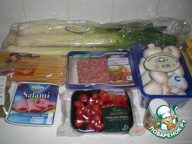 2. В это время чеснок мелко порубить. Грибы помыть, нарезать. Порей почистить, помыть, порезать кольцами и еще пополам. Помидорки помыть и разрезать пополам. Салями порезать кубиками.
