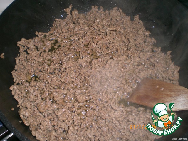4. В большую сковороду налить оливковое масло, пожарить фарш.