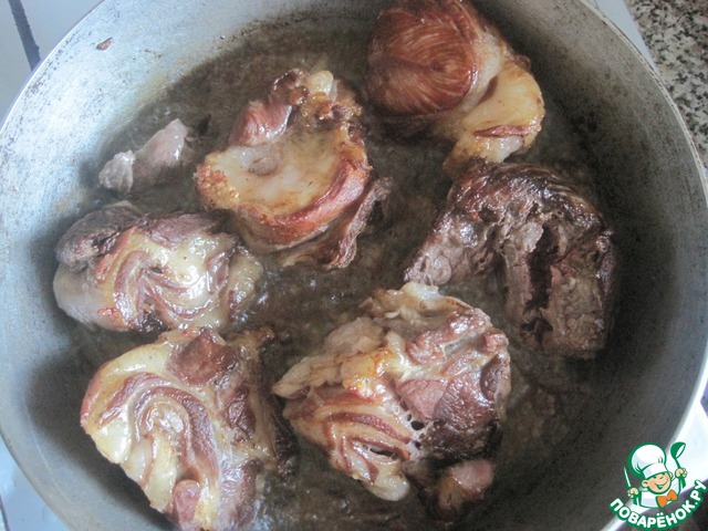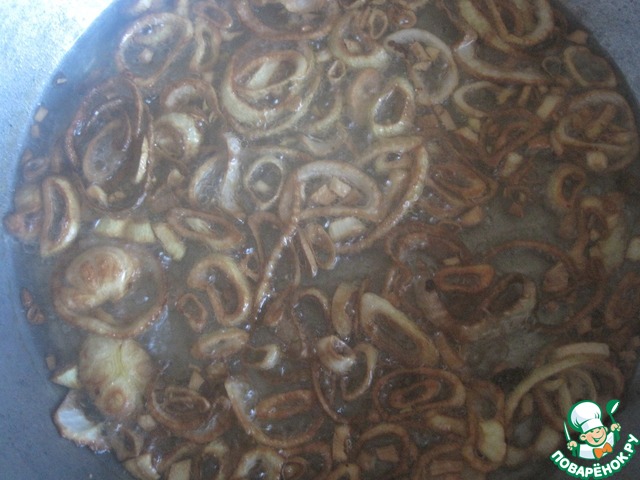 Лук надо жарить на сильном огне, чтобы он стал коричневого цвета. С лука должен выпариться весь сок, чтобы потом мясо не тушилось, а жарилось в этом масле.
