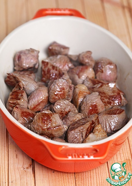 Мясо обжариваем со всех сторон на горячей сковороде с оливковым маслом. Духовку ставим разогреваться до 200-220 градусов.