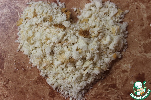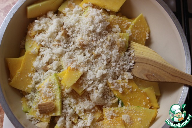 Обжариваю, помешивая, ломтики тыквы в сухарях и крошках на растительном масле...