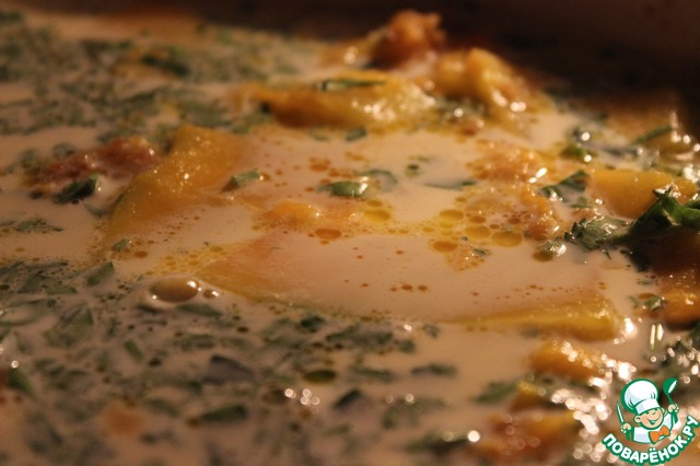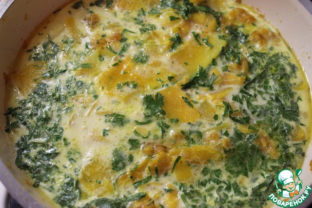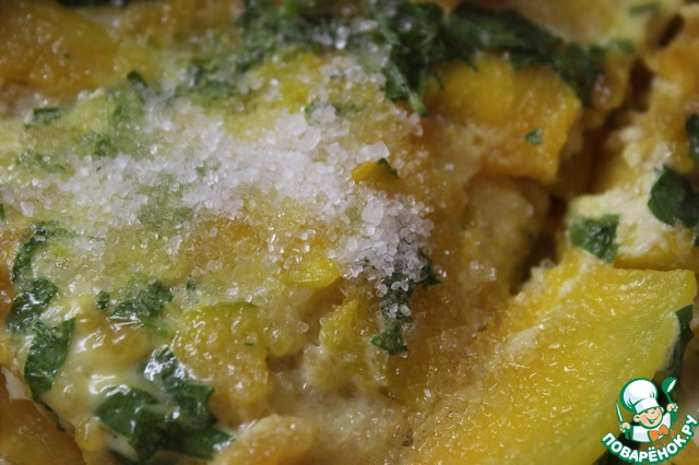 Заливаю тыкву яично-сливочной смесью и отправляю в духовку на 15-25 минут. Температура 180.