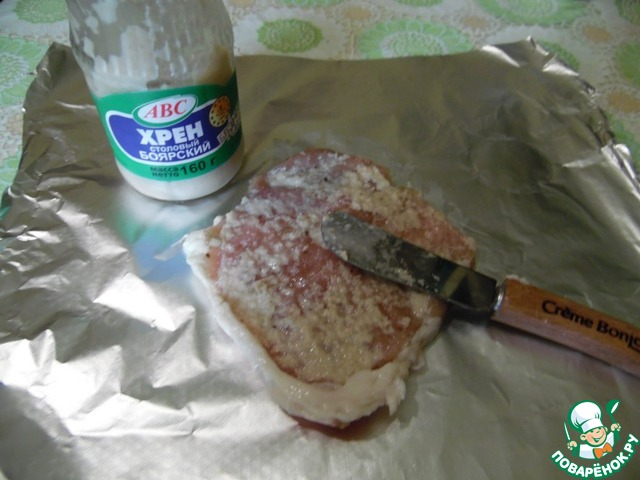 Берем кусочек свинины и выкладываем на фольгу (примерно 25 х 25 см), промазываем хреном