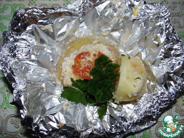 Достаем, украшаем и получаем вот такое красивое и вкусное блюдо! Подаем прямо в фольге, т. к. внутри образуется очень много сока, за что блюдо и получило свое название!