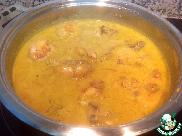 Добавить мохадо к курице и тушить под закрытой крышкой на медленном огне еще 10 минут, пока соус не загустеет.