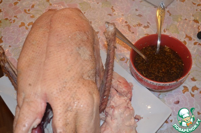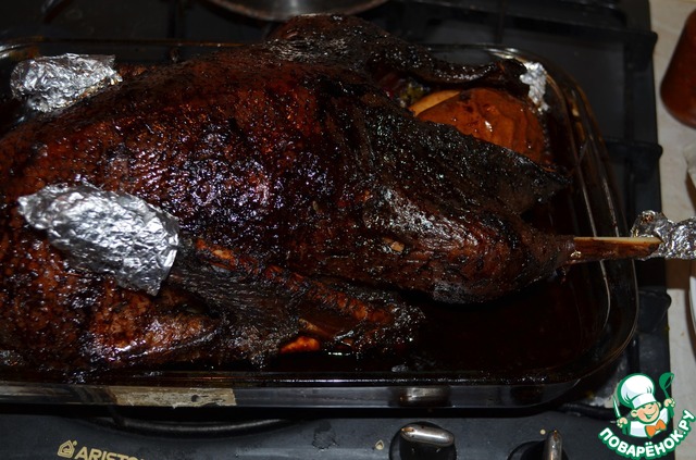Запекайте в духовке при температуре 220град. примерно 1,5часа, периодически поливая соком. Можно в конце накрыть гуся фольгой, чтоб не подгорел.