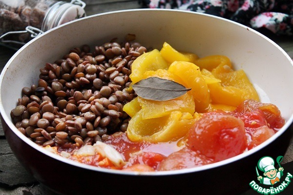 Добавить чечевицу, перец, томаты и лавр, прогреть и перемешать.