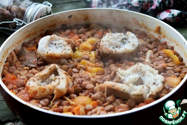 Поместить к чечевице рыбу, посолить, добавитьсвежемолотый перец, накрыть крышкой и тушить 20 минут.