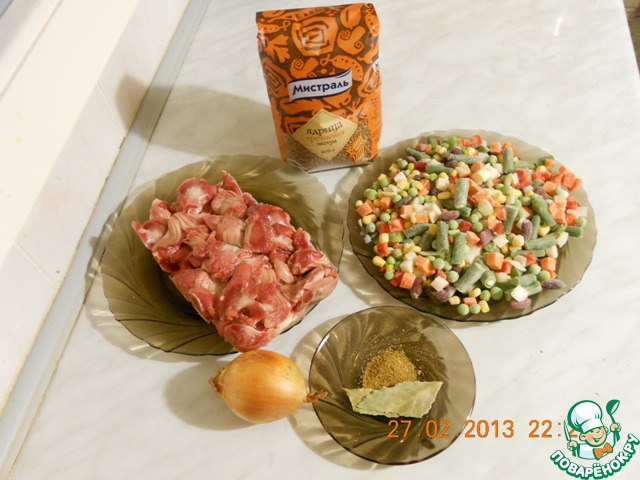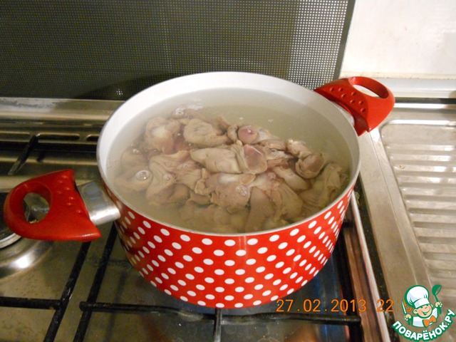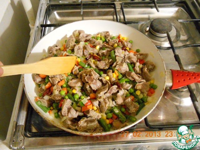 Куриные желудочки нарезать на 2-3 части, добавить к овощам и обжарить 2-3 мин.