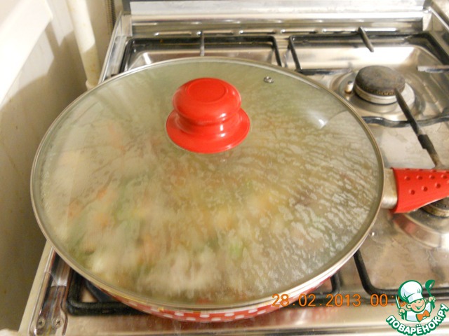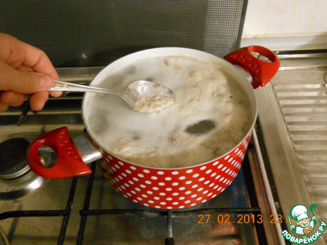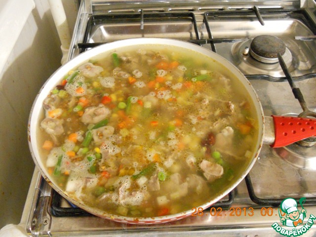 Накрыть крышкой после закипания и готовить на медленном огне 30 мин. За 5 мин до готовности добавить лавровый лист.