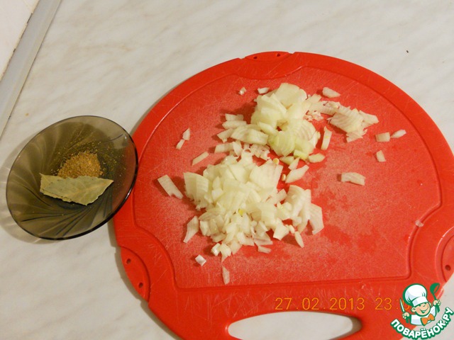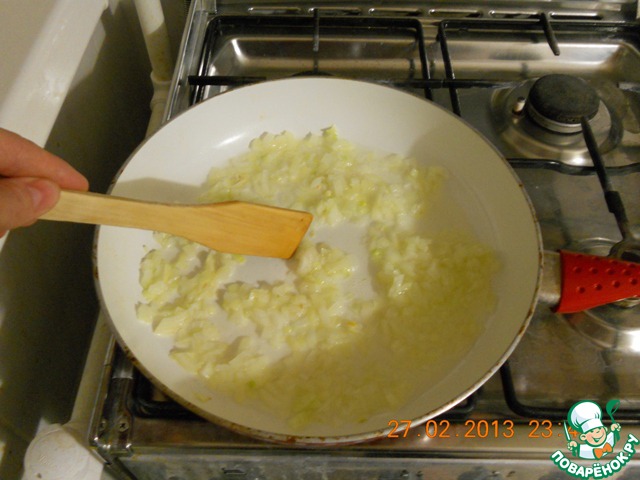 Обжарить лук до золотистого цвета на небольшом кол-ве раст. масла.
